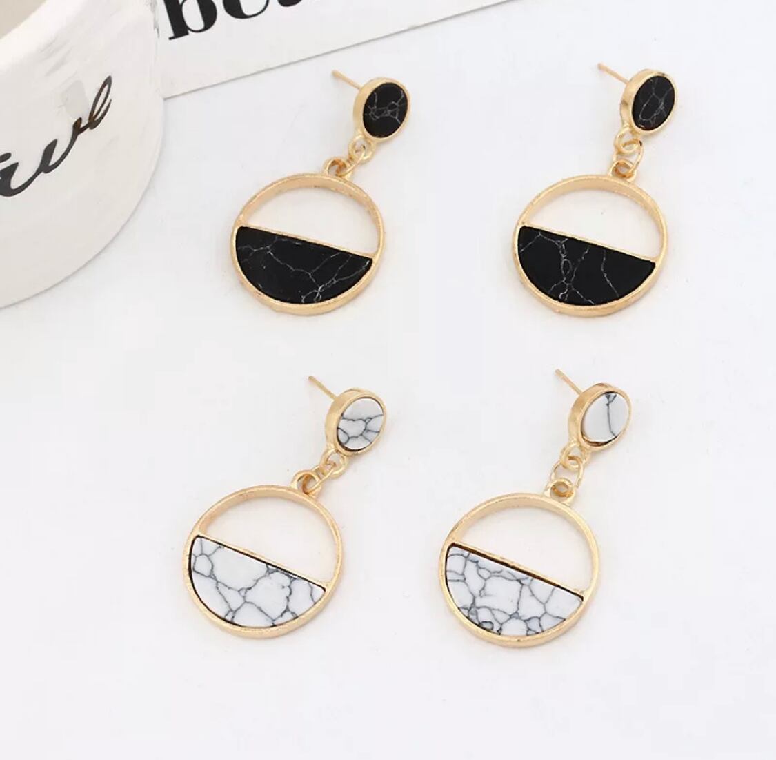 ホワイト大理石ピアス ゴールドピアス レトロピアス シックピアス
